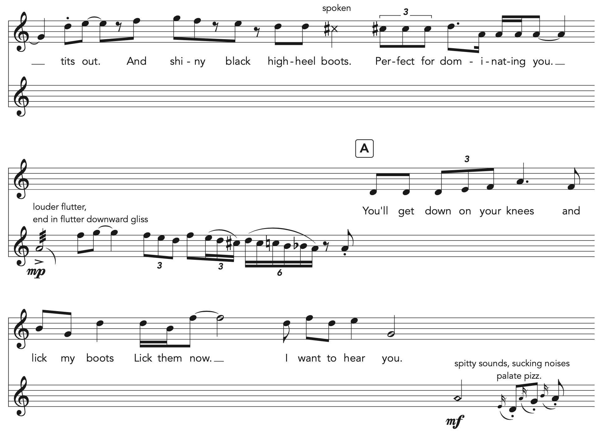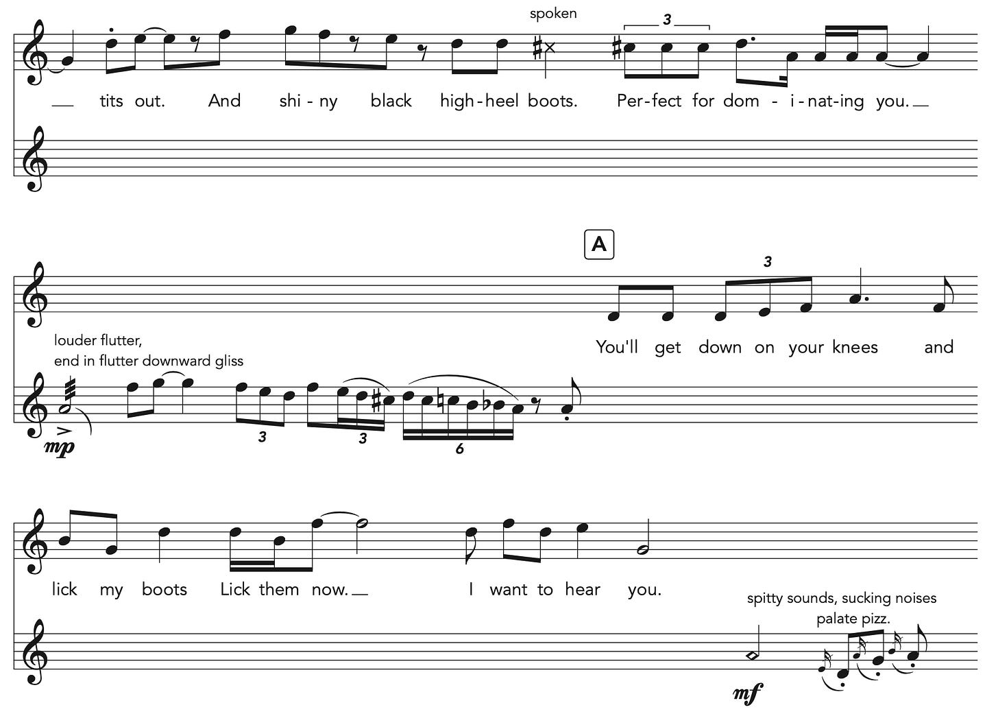 Duo Sydeboob Sarah Steranka and Anna Elder rehearse my work, Mitu Theater, Brooklyn. Below, score excerpt.